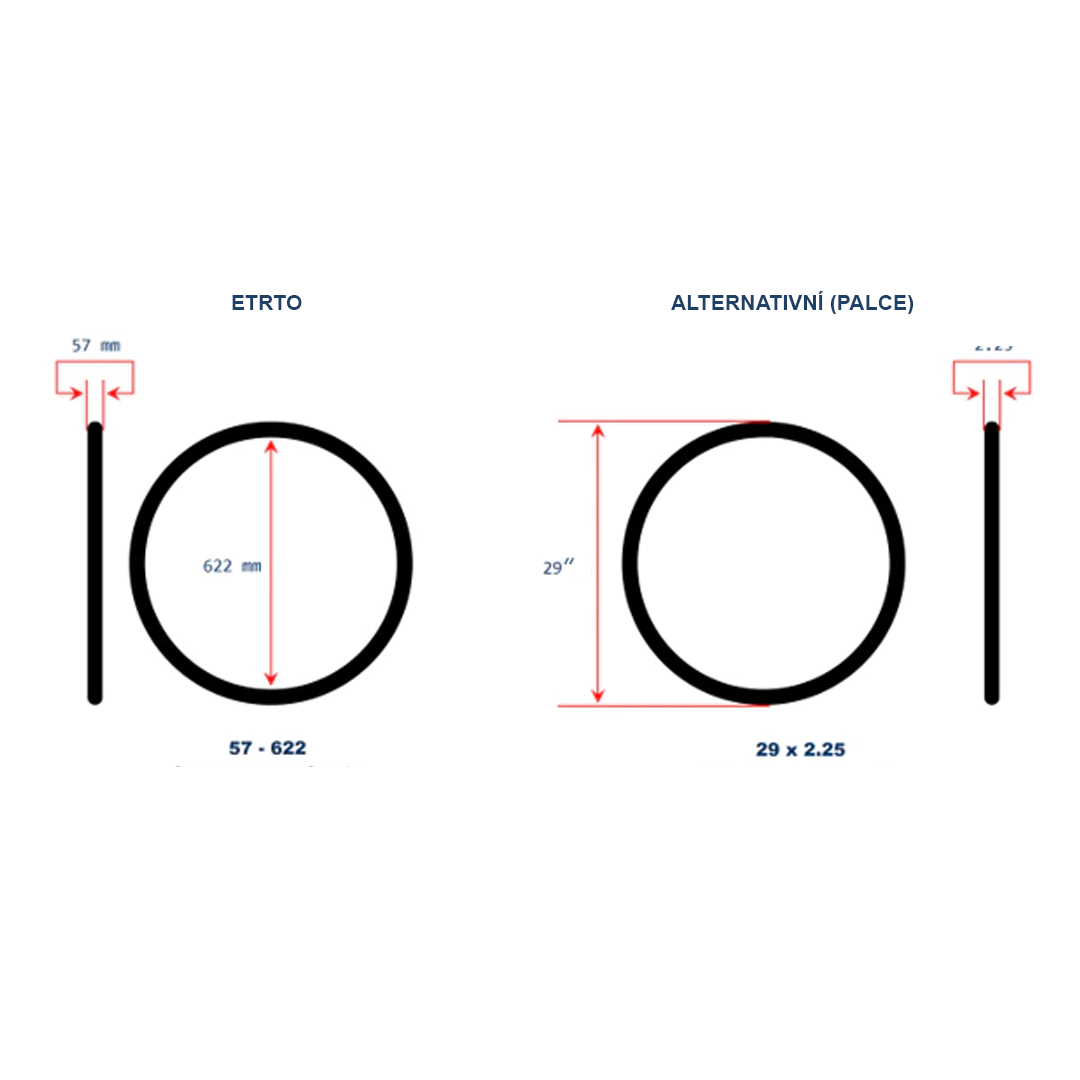 Pro jednodušší orientaci v systémech značení rozměrů jsme připravili krátký přehled toho, jaké jsou rozdíly mezi ETRTO a alternativním značením. ETRTO určuje vnitřní průměr v mm, zatímco alternativní je vnější průměr v palcích. Šířky plášťů pro ETRTO jsou uvedeny v mm a pro alternativní velikosti v palcích.