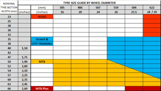 We always recommend replacing your bicycle’s tyres with the same size as the original equipment. Tyre width and wheel diameter are specified in millimeters by ETRTO but measurement in inches may also be used as an alternative.