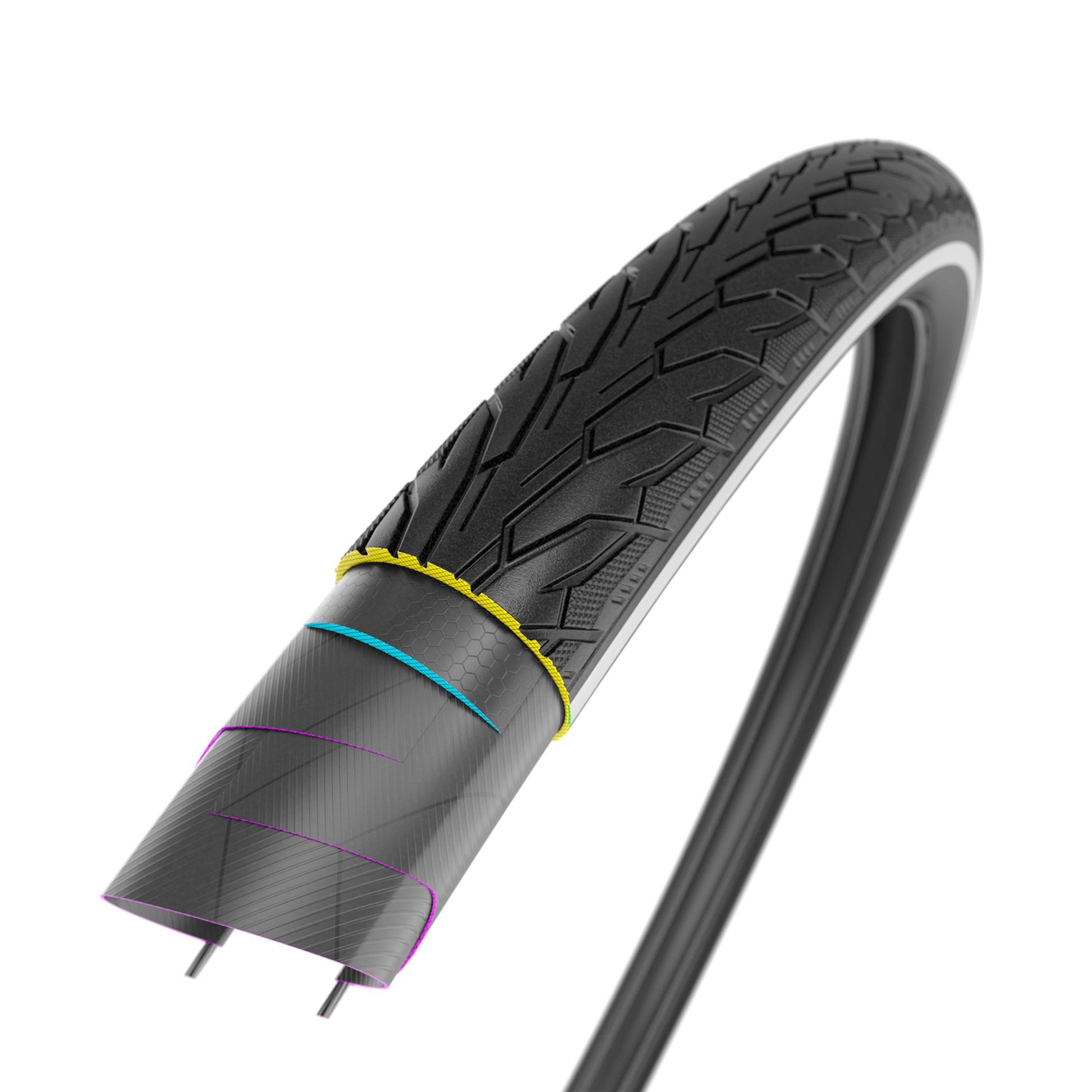 A band of 1 mm thick special rubber placed between the tread and the carcass decreases the possibility of having a puncture (high structural strength and hardness). It increases the rigidity and strength of the tyre crown and decreases the tyre drag while maintaining.